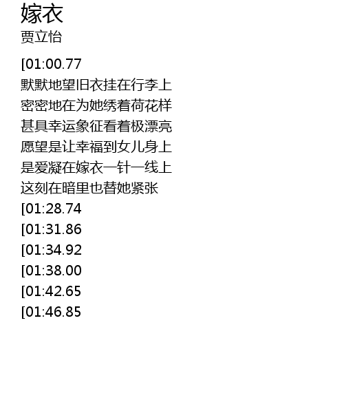 | [00:08.21][01:00.77][01:51.97] | 贾立怡-嫁衣(粤) |