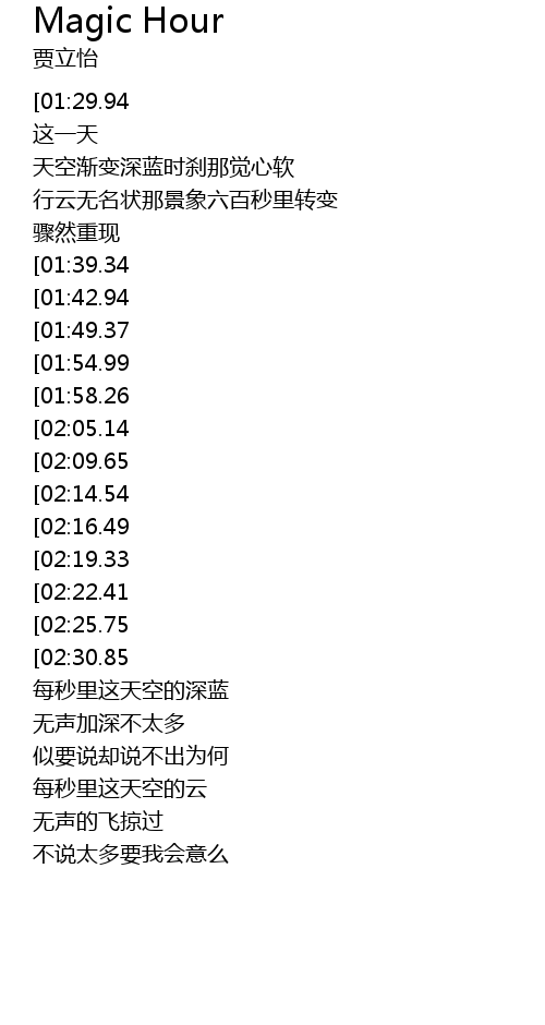 | [00:08.97][01:29.94][03:29.95] | 贾立怡-Magic Hour(粤) |
