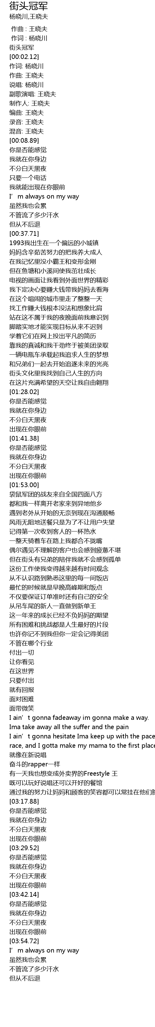 | [01:22.64] | 街头文化里我找到自己人生的方向 |
