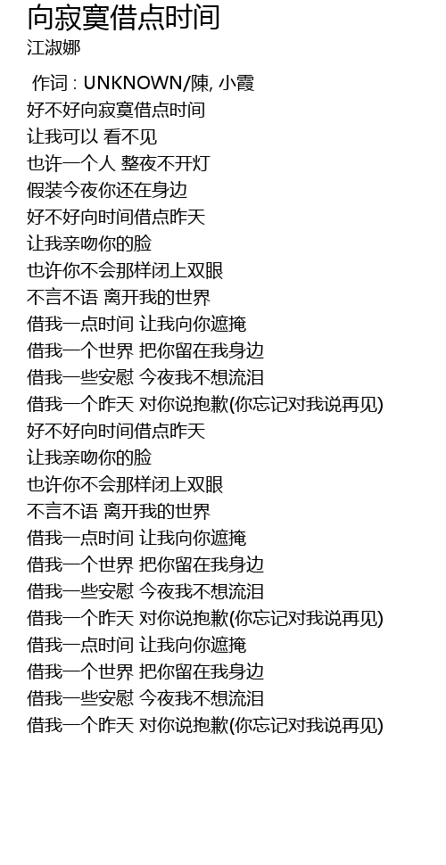 | [00:00.00] | 作词 : UNKNOWN/陳, 小霞 |