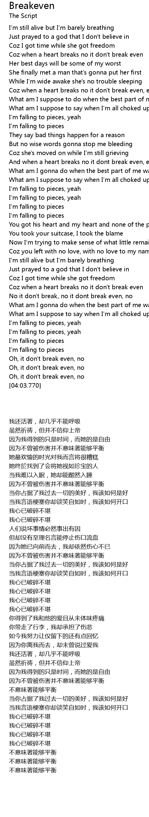 | [03:03.900] | Coz when a heart breaks no it don' t break even |