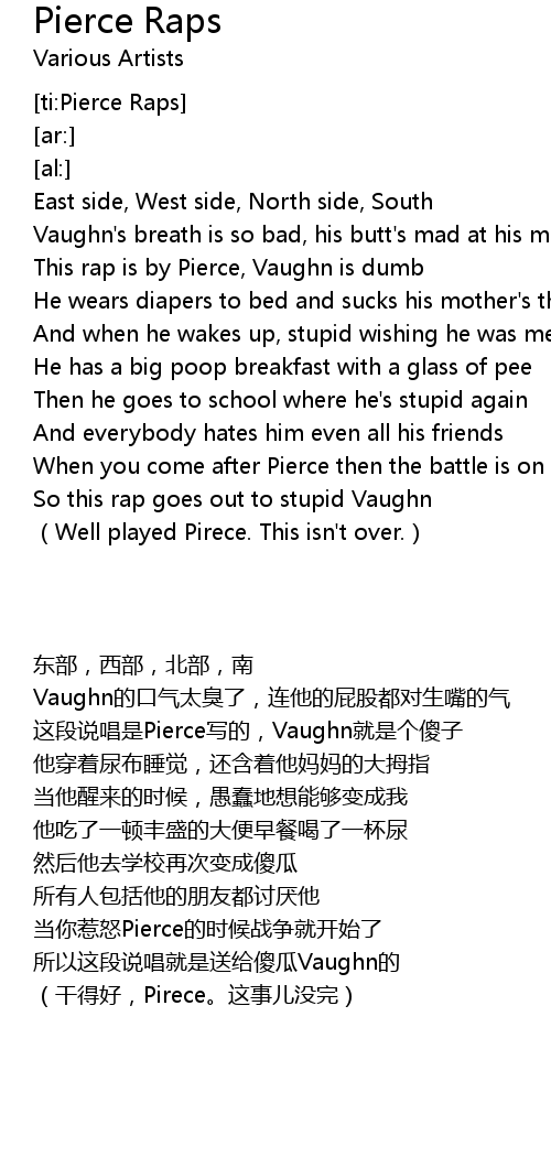 | [00:05.40] | This rap is by Pierce, Vaughn is dumb |