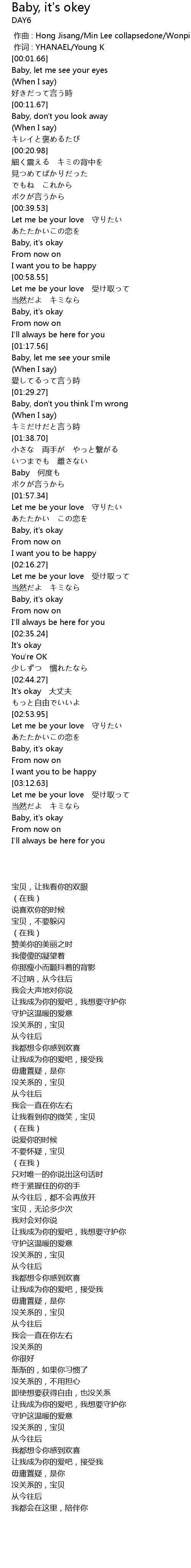 | [00:00.000] | zuo qu : Hong Jisang Min Lee collapsedone Wonpil Sungjin Jae |