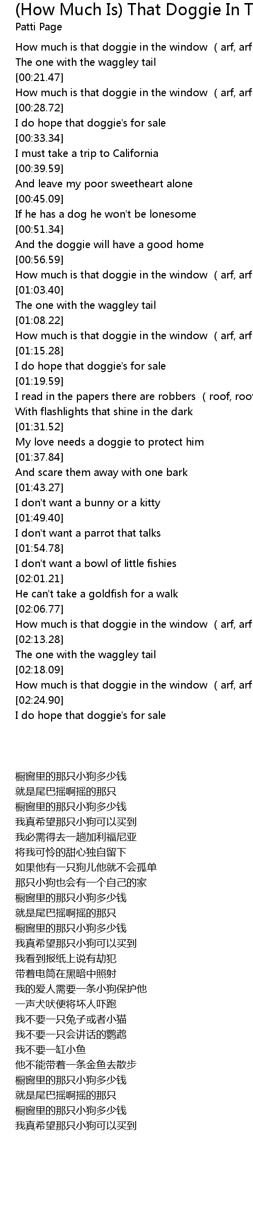 | [00:23.53] | How much is that doggie in the window arf, arf |
