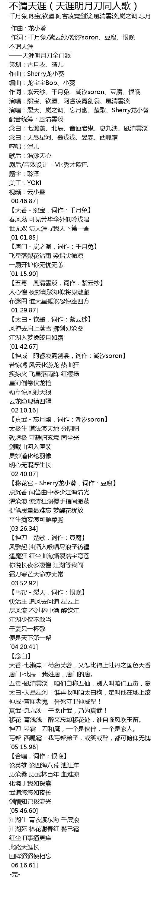 | [00:20.73] | 演唱:裂天、岚之调、忘月幽、楚歌、Sherry龙小葵 |