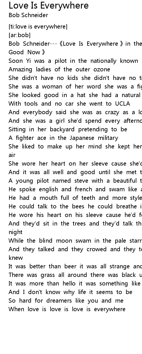 | [00:02.75] | Bob Schneider---《Love Is Everywhere 》in the album 《I'm Good Now 》 |