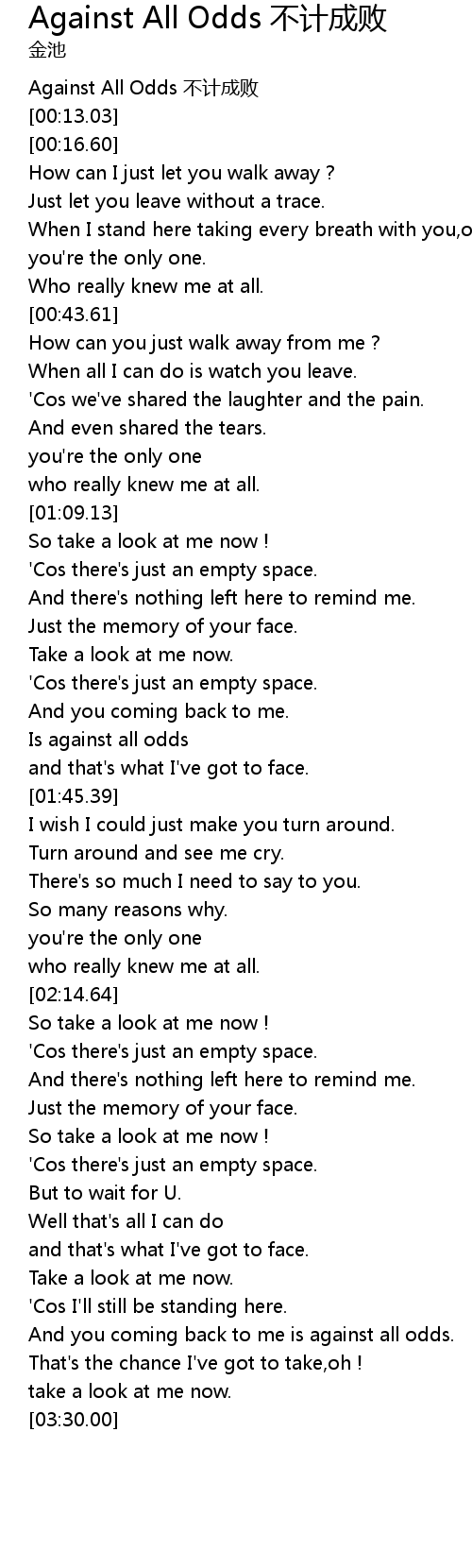 | [00:01.20] | Against All Odds bu ji cheng bai |