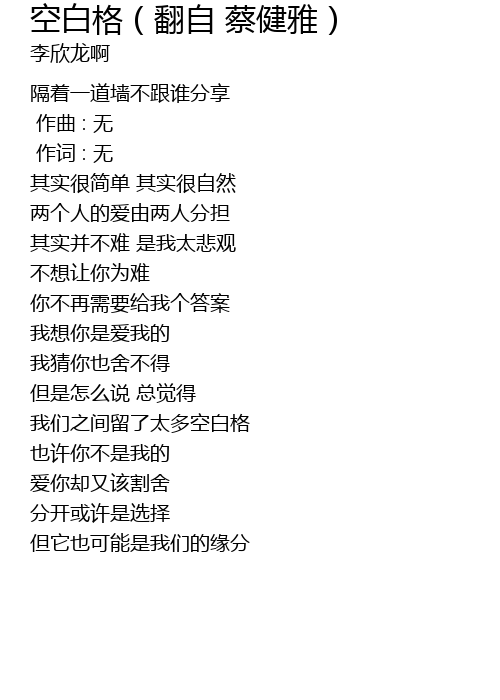 | [00:57.000] | wǒ men zhī jiān liú le tài duō kòng bái gé |