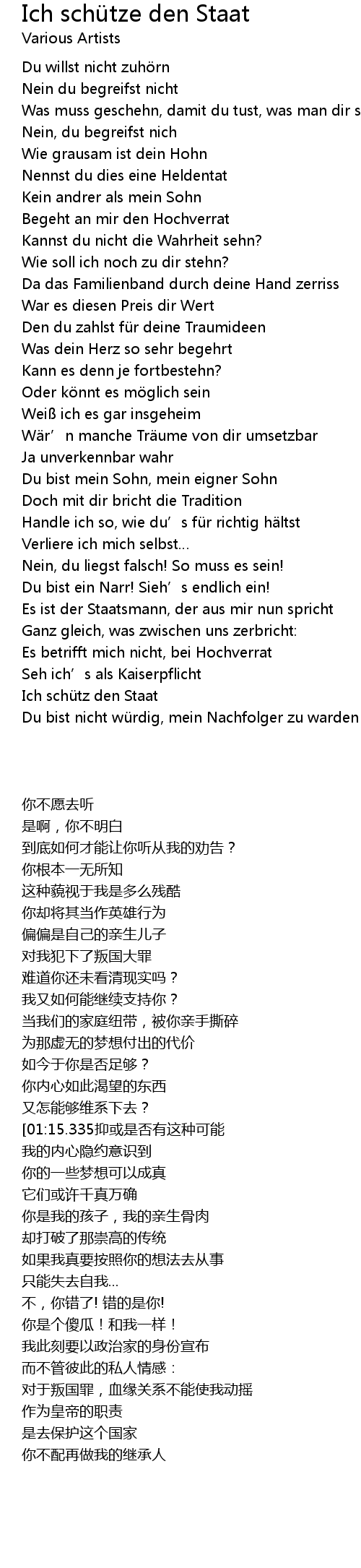| [01:55.086] | Es ist der Staatsmann, der aus mir nun spricht |