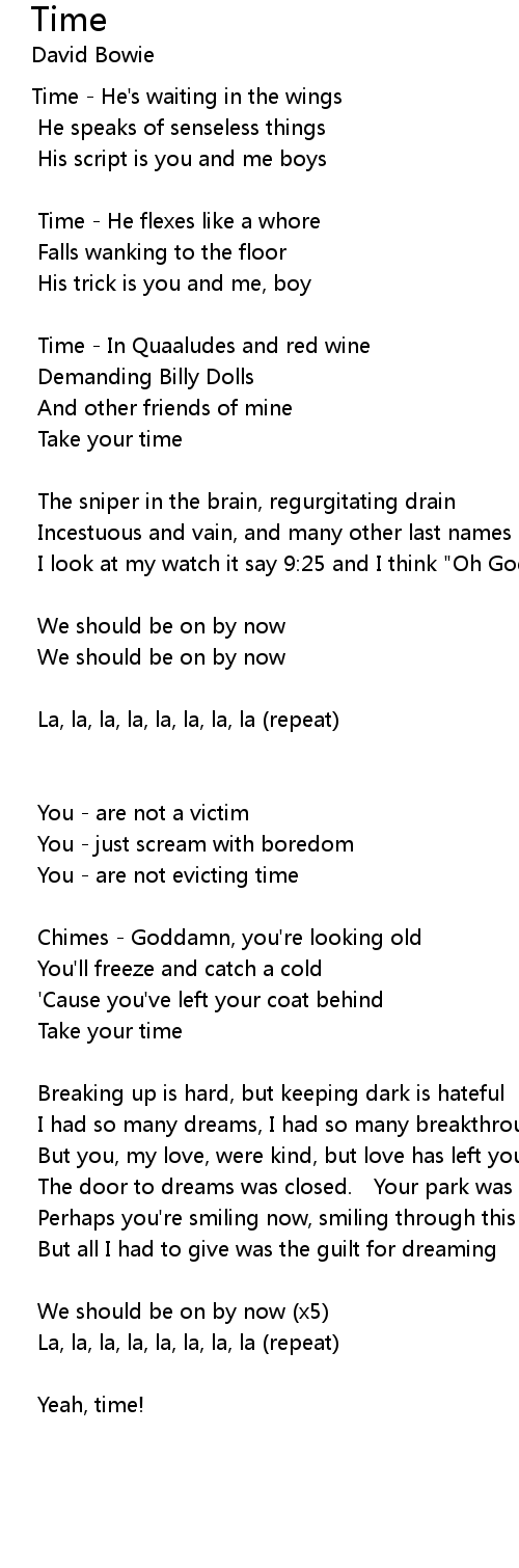 | I look at my watch it say 9:25 and I think "Oh God I'm still alive" | |