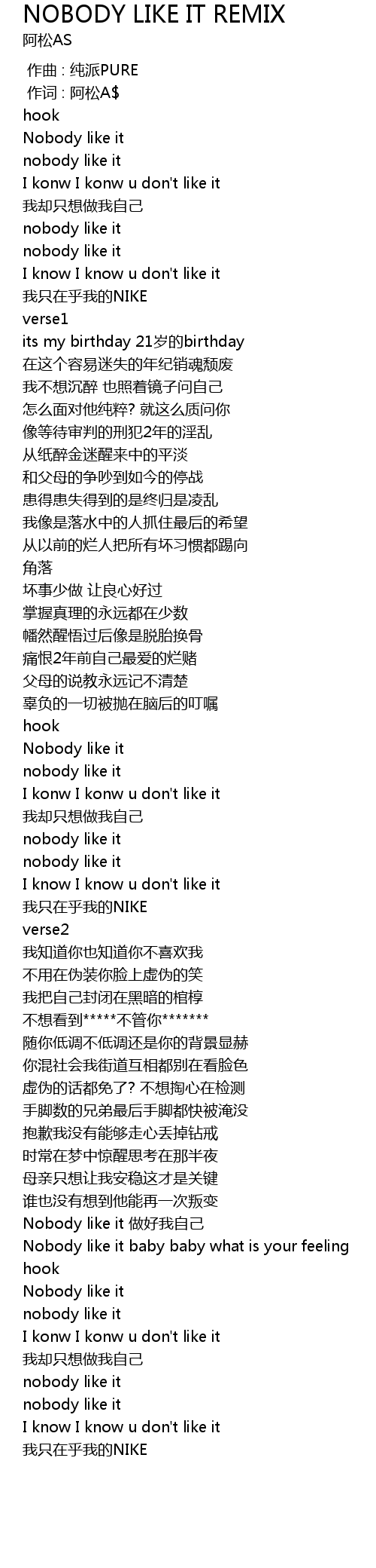| [02:09.662] | Nobody like it zuo hao wo zi ji |
