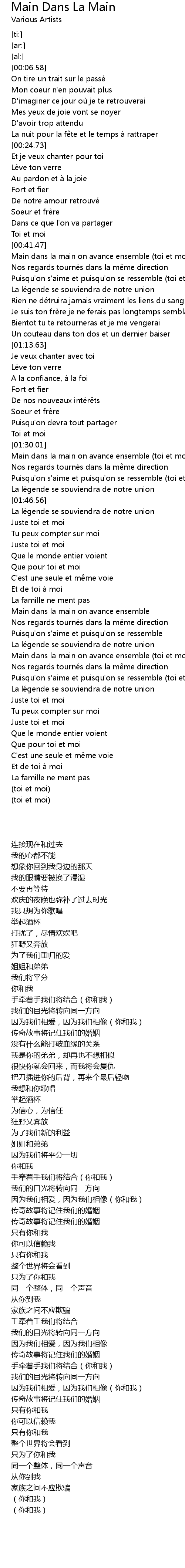 | [01:30.37] | Main dans la main on avance ensemble (toi et moi) |