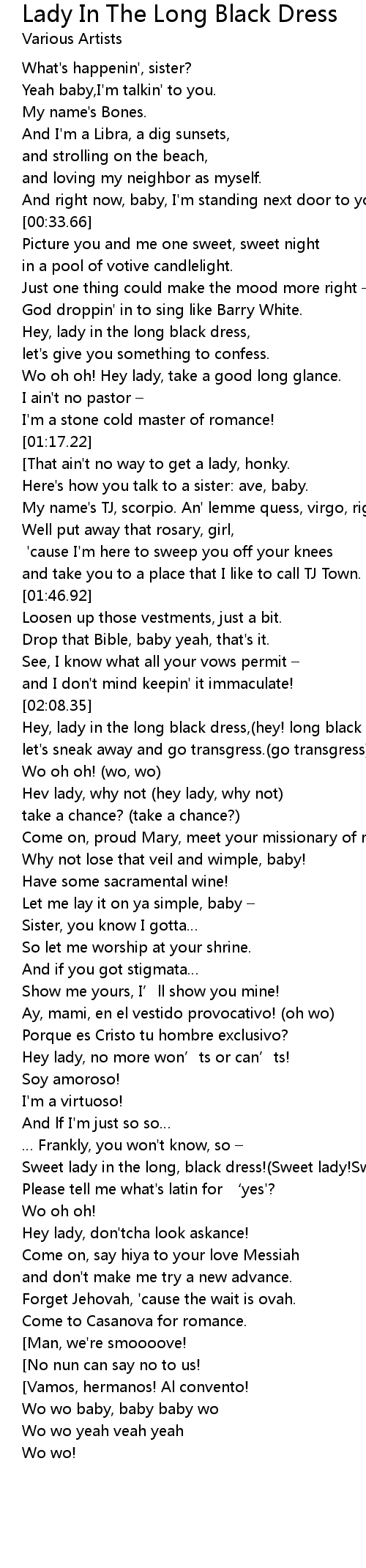 | [03:28.35] | Sweet lady in the long, black dress!(Sweet lady!Sweet lady!) |