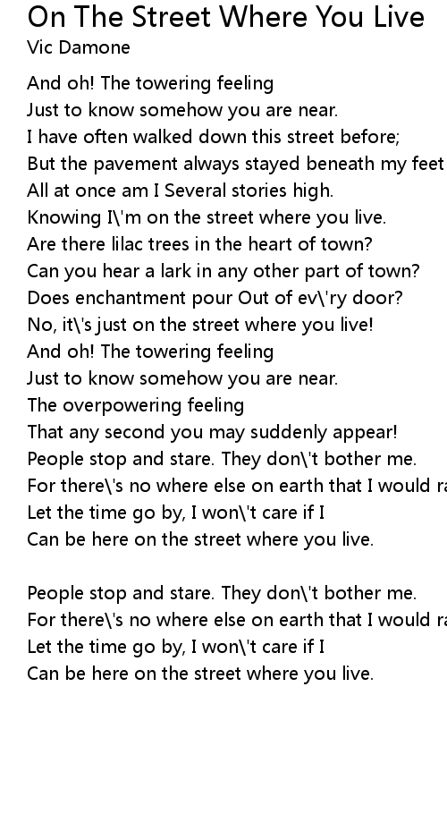 | Knowing I\'m on the street where you live. | |