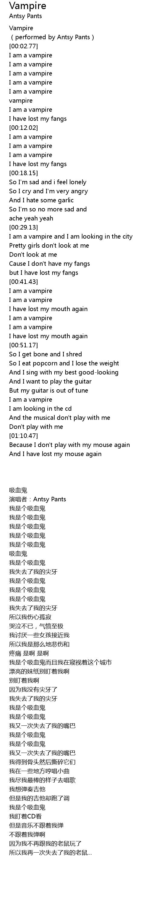 | [00:29.48] | I am a vampire and I am looking in the city |