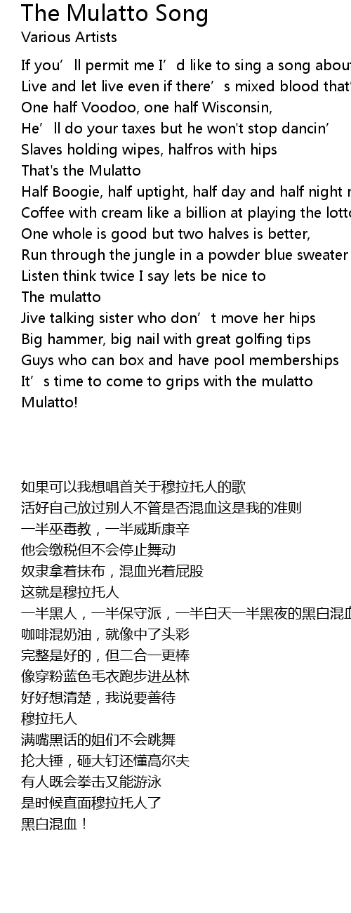 | [00:04.181] | If you' ll permit me I' d like to sing a song about the mulatto |