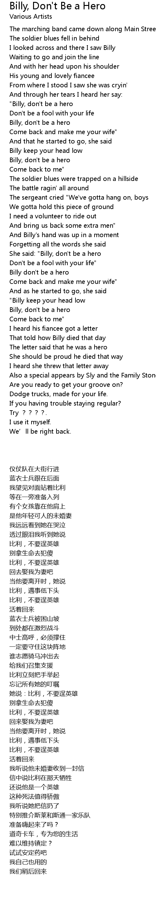 | [01:49.269] | She said: " Billy, don' t be a hero |