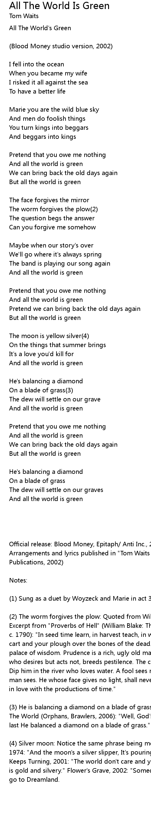 Arrangements and lyrics published in "Tom Waits Blood Money" (Amsco Publications, 2002) |