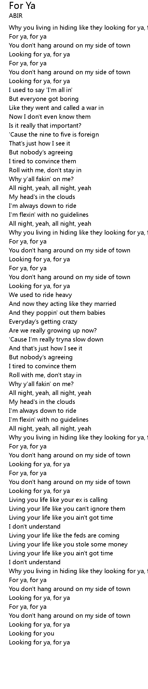 | [02:34.593] | Why you living in hiding like they looking for ya, for ya? |
