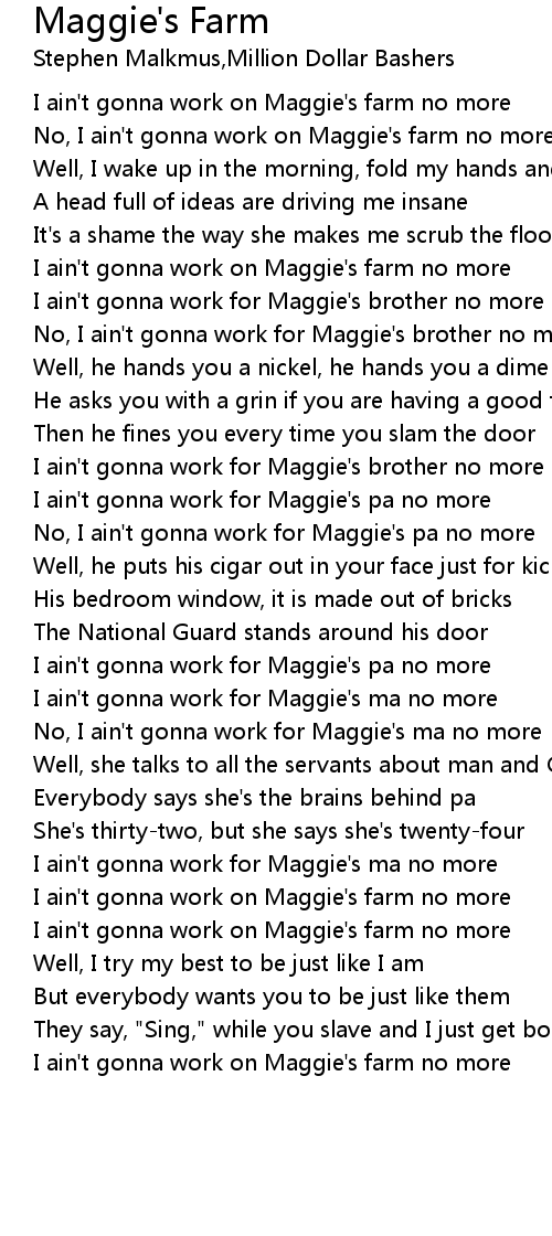 No, I ain't gonna work on Maggie's farm no more |