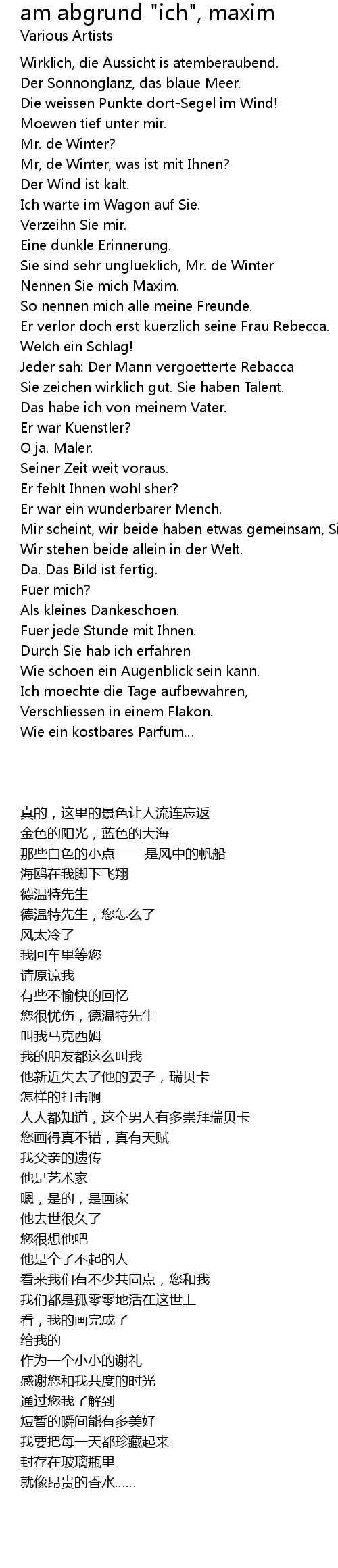 | [01:48.677] | Mir scheint, wir beide haben etwas gemeinsam, Sie und ich. |