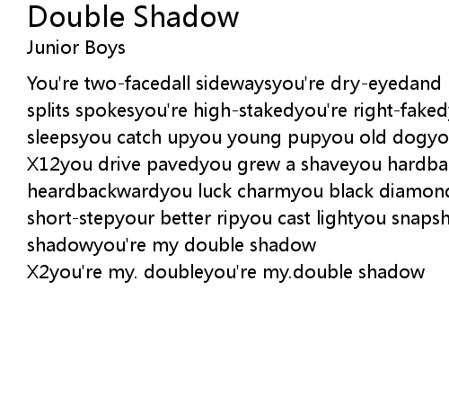 X12you drive pavedyou grew a shaveyou hardballyou held goldyou last heardbackwardyou luck charmyou black diamondyour next kinyour lost twinyour short-stepyour better ripyou cast lightyou snapshotyeah, you're my double shadowyou're my double shadow |