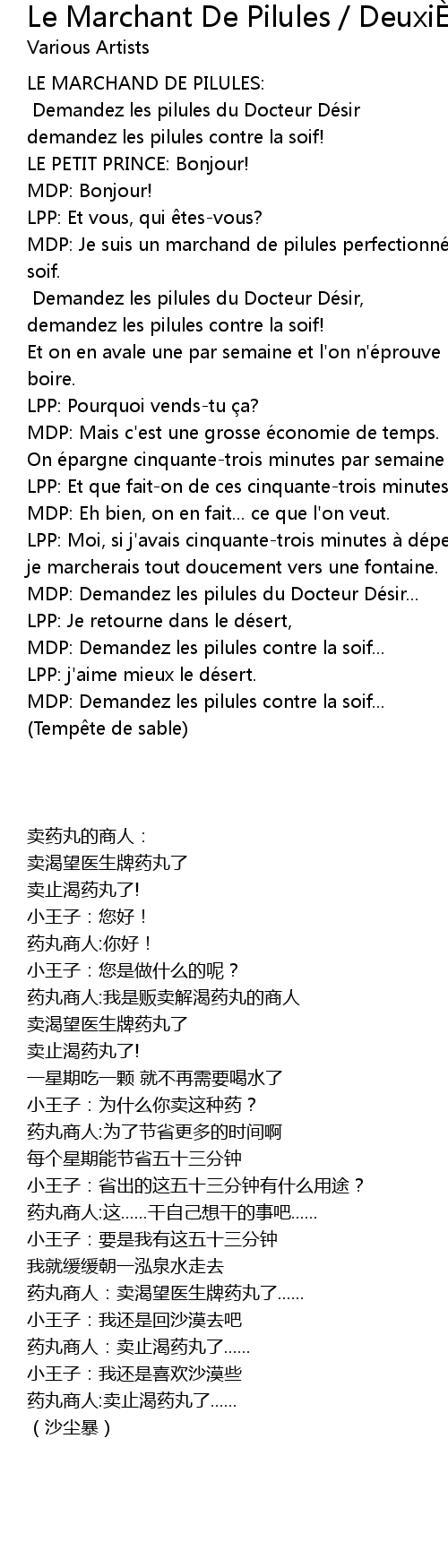 | [00:11.68] | MDP: Je suis un marchand de pilules perfectionne es qui apaisent la soif. |