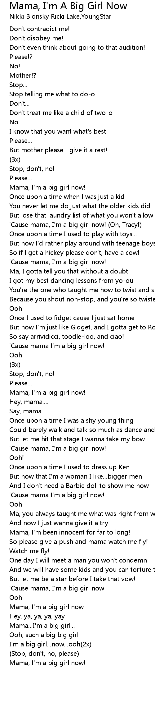 | 'Cause mama, I'm a big girl now! (Oh, Tracy!) | |