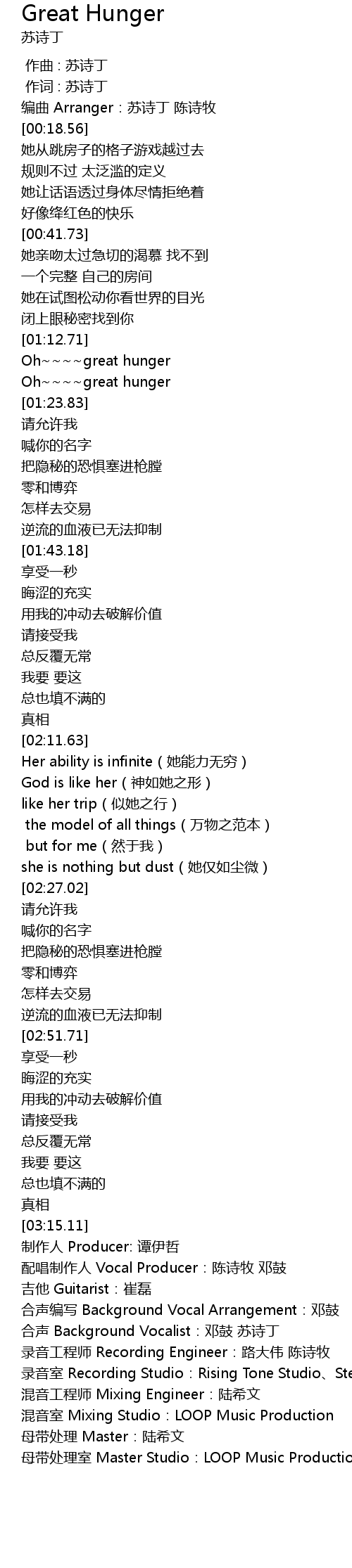 | [03:16.74] | 配唱制作人 Vocal Producer:陈诗牧 邓鼓 |