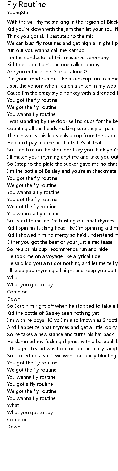 We can bust fly routines and get high all night I pack rhymes like ammo, never run out you wanna call me Rambo