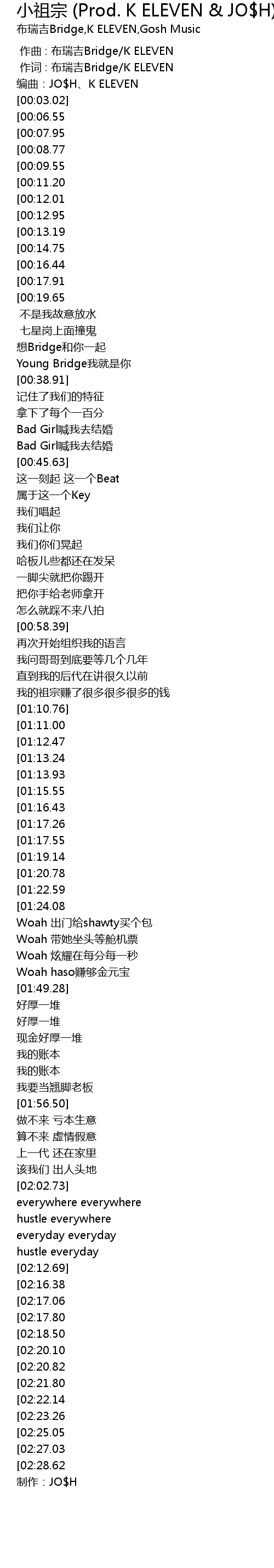 | [00:02.38] | 编曲:JO$H、K ELEVEN |