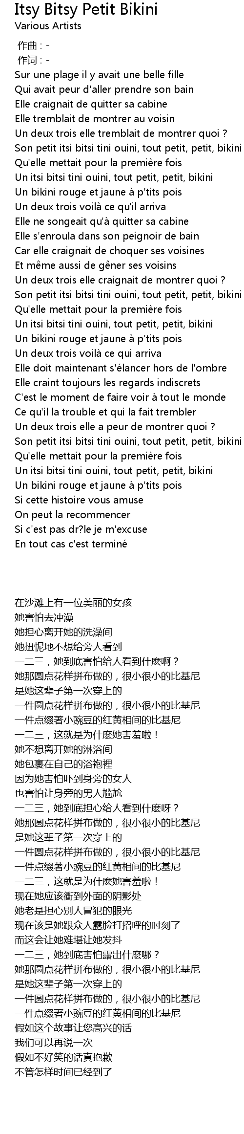 | [00:23.52] | Son petit itsi bitsi tini ouini, tout petit, petit, bikini |