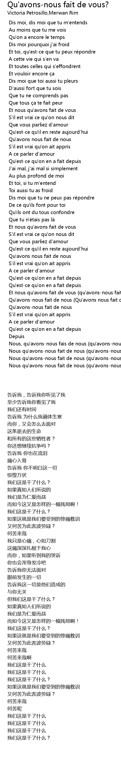 | [03:28.150] | Qu' avonsnous fait de nous Qu' avons nous fait de vous |