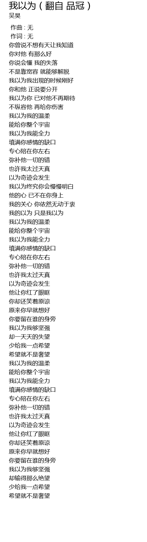| [02:34.210] | wǒ de yǐ wéi zhǐ shì wǒ yǐ wéi |