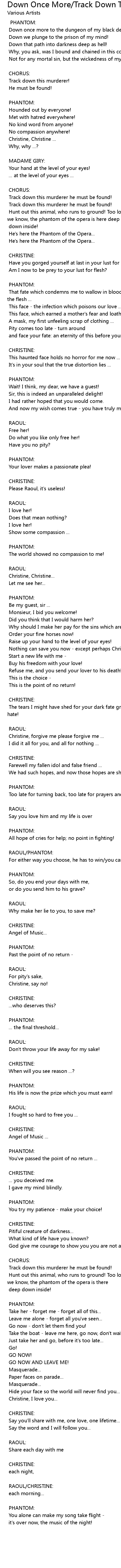 Hunt out this animal, who runs to ground! Too long he's preyed on us, but now we know, the phantom of the opera is here deep |