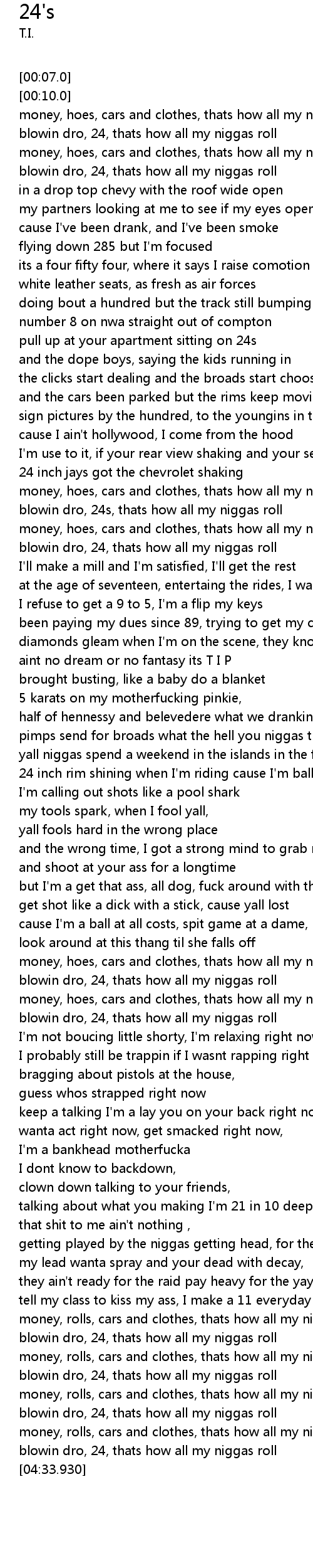 | [01:34.509] | money, hoes, cars and clothes, thats how all my niggas know |