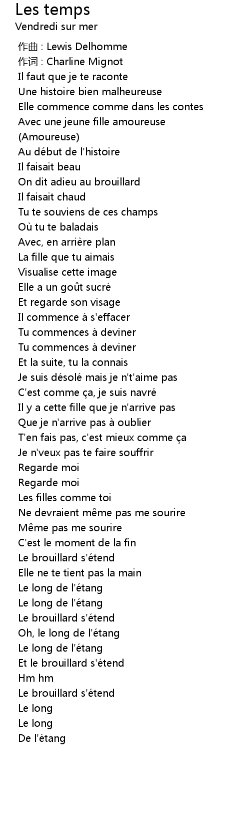 | [01:18.973] | Il y a cette fille que je n' arrive pas |