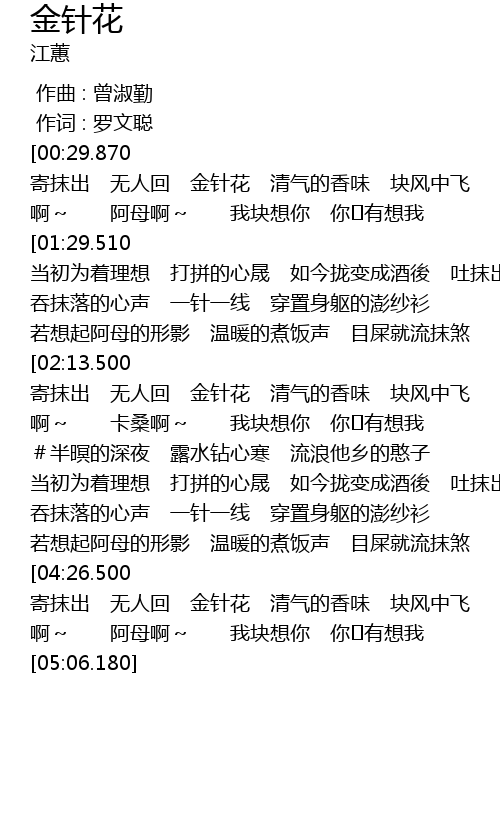 | [04:46.650] | 寄抹出 无人回 金针花 清气的香味 块风中飞 |