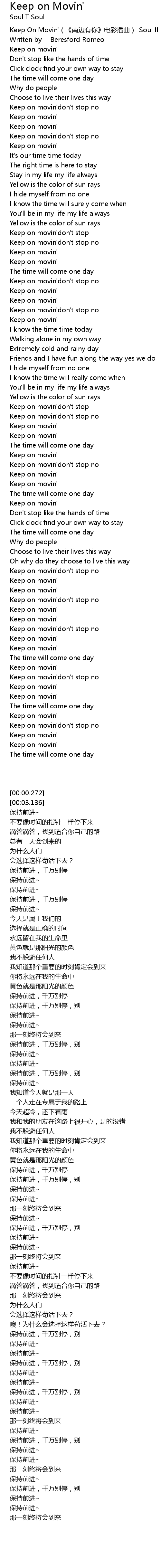 | [00:00.272] | Keep On Movin'(《南边有你》电影插曲)-Soul II Soul |