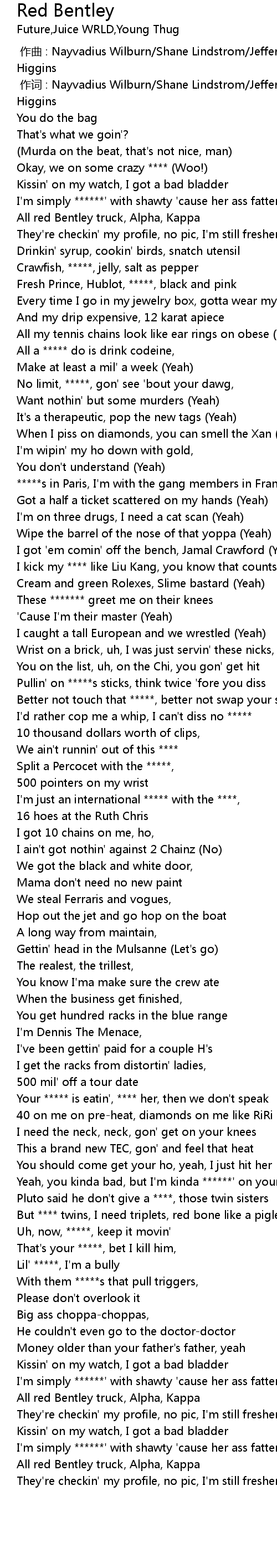 | [02:42.96] | But **** twins, I need triplets, red bone like a piglet |
