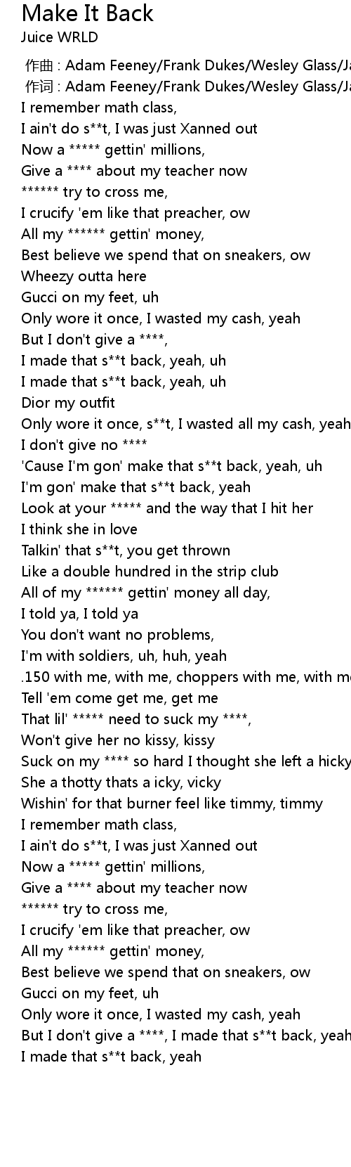 | [00:36.10] | I'm gon' make that s**t back, yeah |