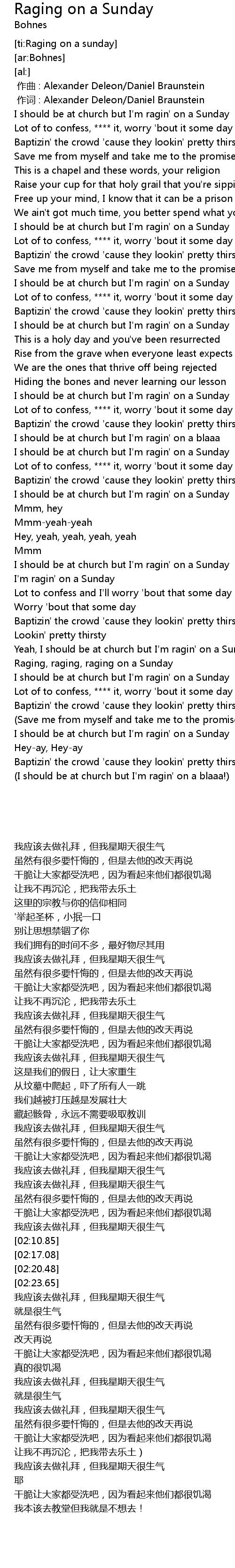 | [02:59.22] | I should be at church but I'm ragin' on a Sunday |