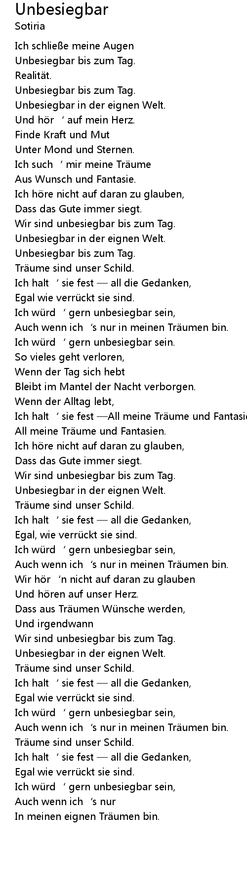 | [01:19.359] | Ich wü rd' gern unbesiegbar sein. |