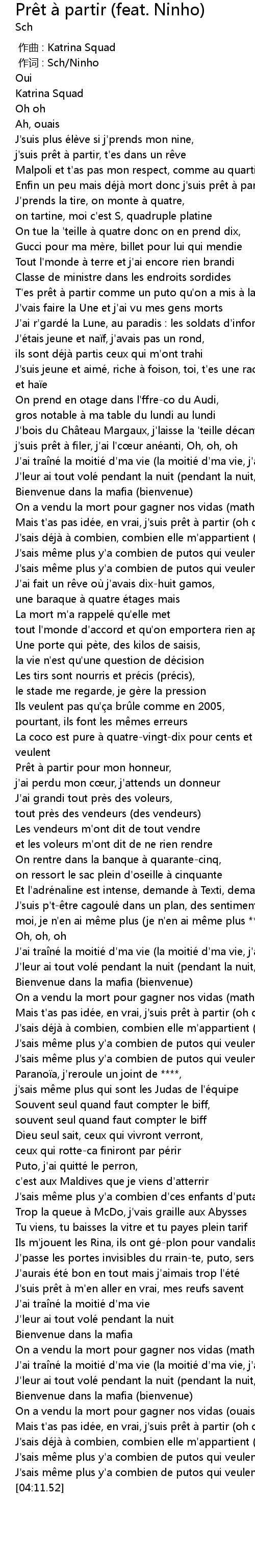 | [03:56.91] | Mais t' as pas ide e, en vrai, j' suis pr t a partir oh oui |