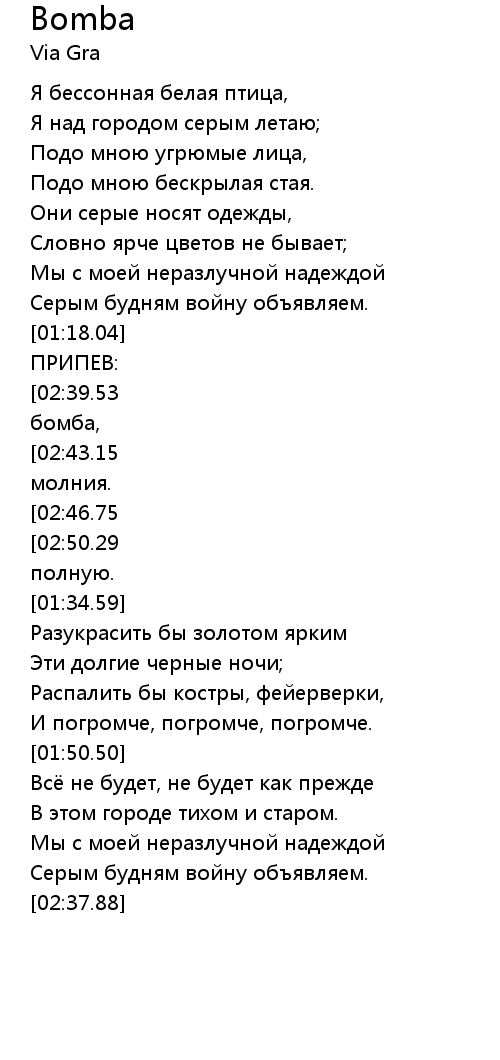 | [03:08.30][02:39.53][02:06.59][01:52.01][01:19.44] | И полетела бомба, |