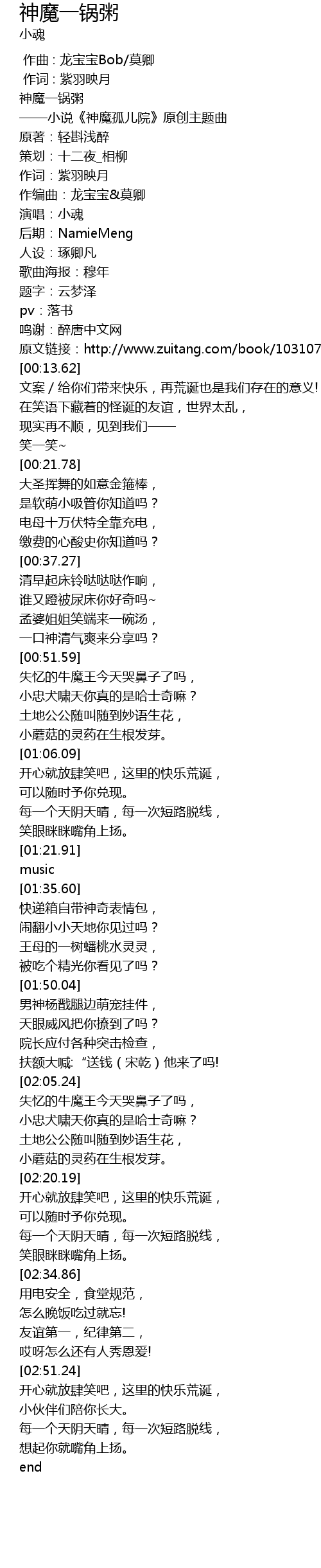 | Album | 神魔一锅粥——小说《神魔孤儿院》原创主题曲 |
