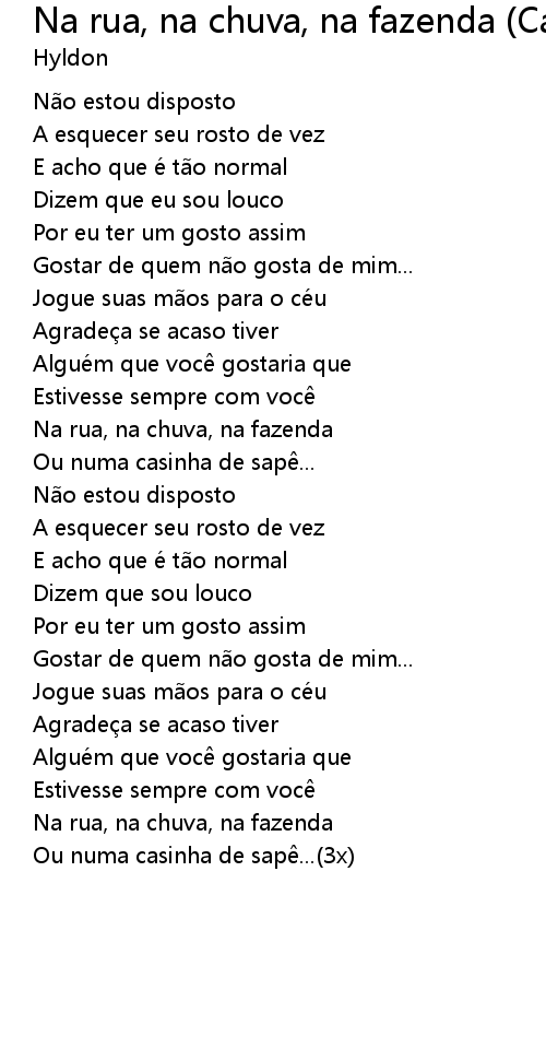 | Song | Na rua, na chuva, na fazenda (Casinha de Sapê) |