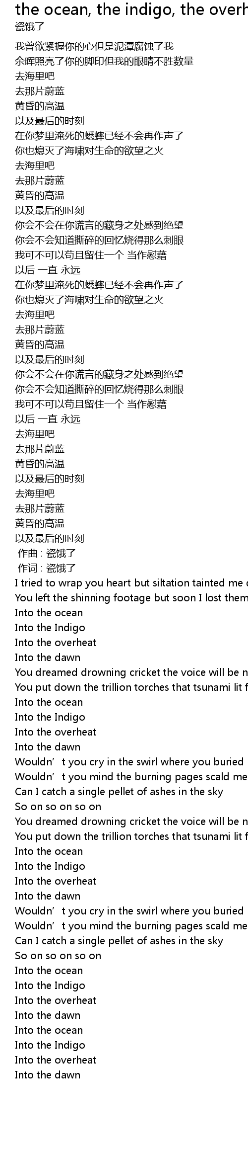 | Song | the ocean, the indigo, the overheat, the dawn |