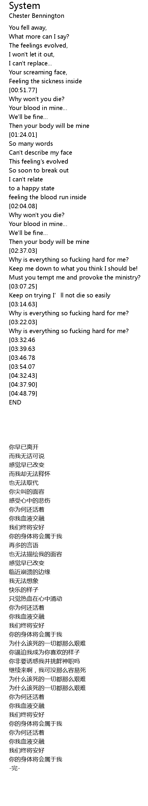 | [04:01.42][03:32.46] | Why won' t you die? |