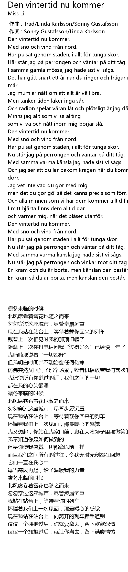 | [00:00.000] | zuò qǔ : Trad Linda Karlsson Sonny Gustafsson |